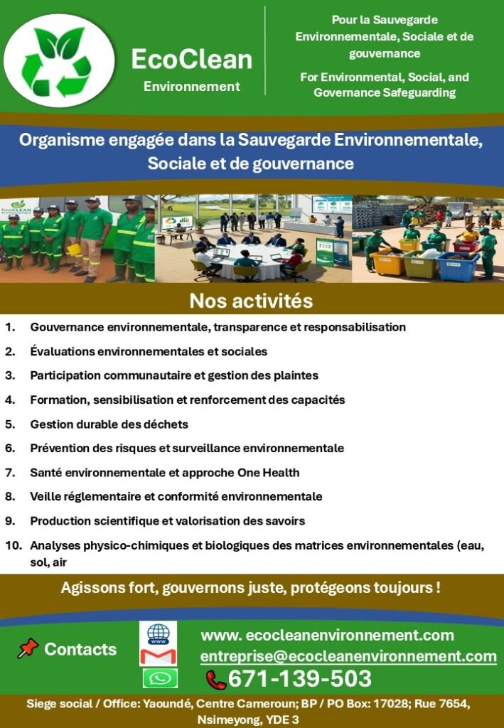 EcoClean Environnement est une organisation engagée dans la promotion d’une gouvernance environnementale responsable et dans la mise en œuvre de solutions durables pour répondre aux défis actuels liés à la santé, au climat et au développement.